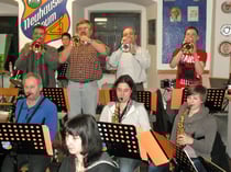 Üben, üben, üben: Bis alle Musikstücke fürs 38. Frühjahrskonzert am 7. April sitzen, bedarf es Ausdauer und jede Menge gemeinsame Proben. Doch wie das Trompetenregister (stehend), das hier für sein Solo übt, haben alle 30 Musiker ihren Spaß an der jährlichen Herausforderung. Bild: mlb