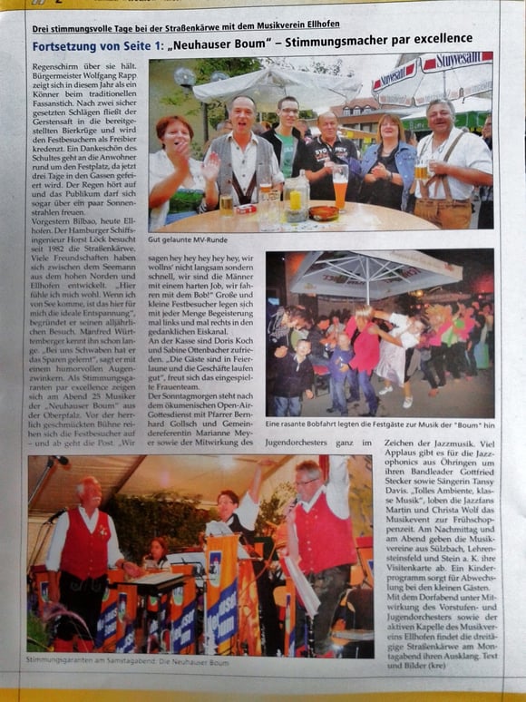 Entsprechend zufrieden zeigte sich die Kapelle mit dem Festverlauf. Auch die Gäste freuten sich über das Glück der "Neuhauser Boum", endlich einmal mit schönem Wetter gesegnet zu sein. Allerdings konnte sich so mancher mit einem Augenzwinkern die Vermutung nicht verkneifen, dass nur das Bankerlfest der Feuerwehr sowie der Zoiglausschank auf dem Schafferhof, die beide seit Jahren gutes Wetter versprechen, am Wochenende den Sonnenschein gesichert hätten.